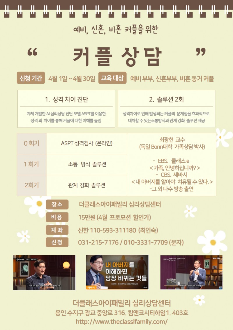가족상담의 권위자인 최광현 교수님과 함께 커플의 행복을 다져보시길 바랍니다.